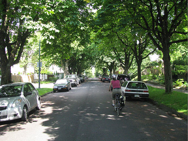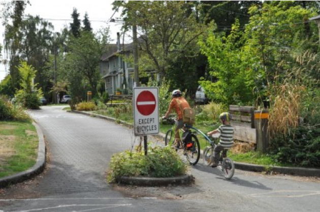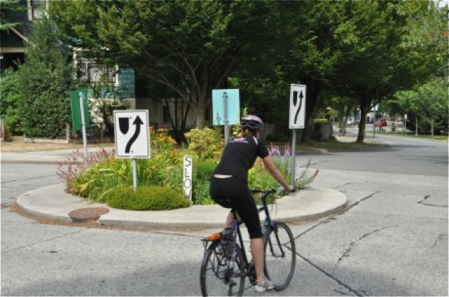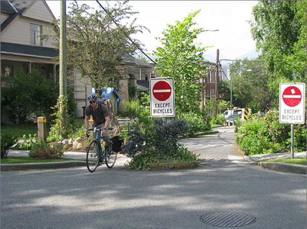 Bike roads are actually just regular streets inside neighbourhoods (like the one right outside your front door) except one end is blocked to car traffic. A decorative barrier, like a plant box, is put on one end of the street so cars cannot pass through and have to go around the block.